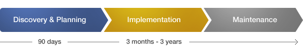 Our process consists of three steps- discovery and planning, implementation and maintenance. The time frame for each step can vary depending on the case: